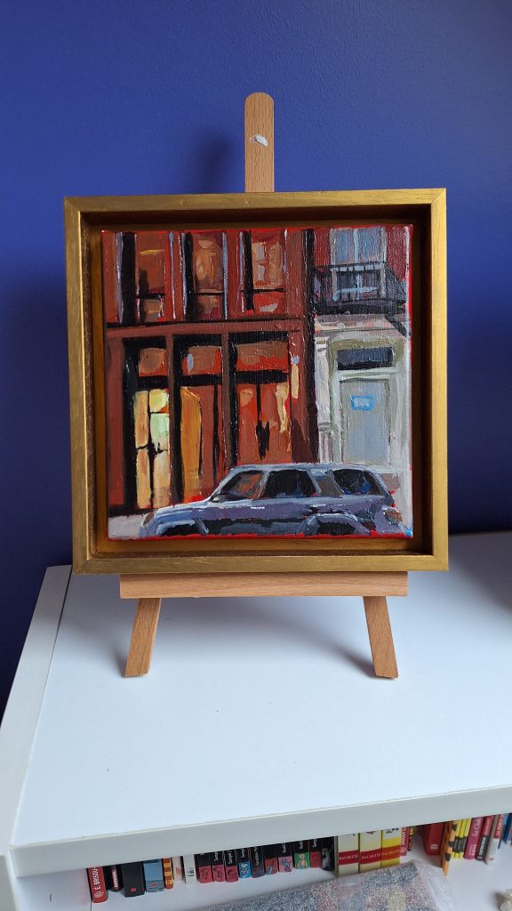 Le tableau est prêt à accrocher au mur, il est protégé par un vernis acrylique brillant qui fait ressortir l’intensité des couleurs, les cotés sont peints en bleu (changement possible).