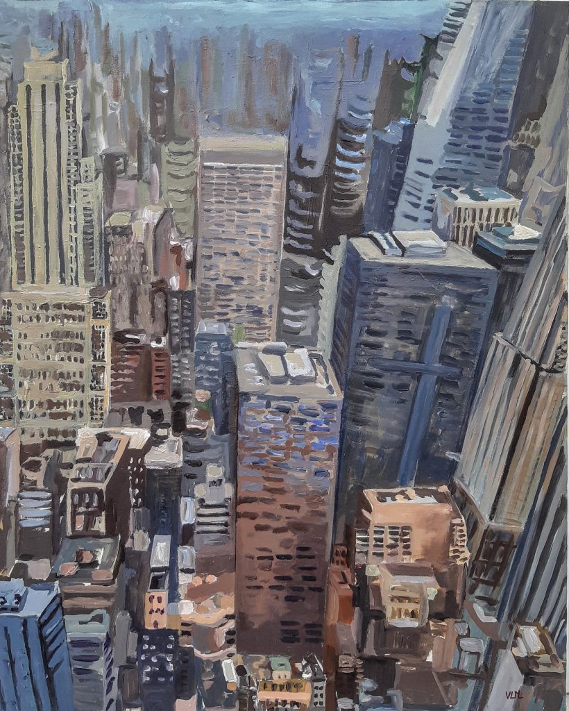 Every inches seem to be filled by concrete. The skyscrapers are pushing one another to reach the sky. I love the craziness of this series and the gentle colors that contrast the effect of lack of space. I’ve painted the city like I feel it not like I see it. This is a interpretation of my feeling with quick brushes of painting, the colors are greyish because it’s the way I interpret this city. If you compare with my feeling of London; often brightly coloured here the tones are more subtle.