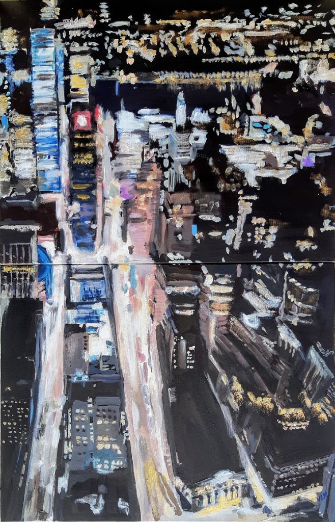 NY brille de mille feux: ici le tableau est presque abstrait, je veux mettre en avant le rêve plutôt que la réalité. Les coups de pinceau sont imprécis, on sent une atmosphère plus qu’on ne la voit;