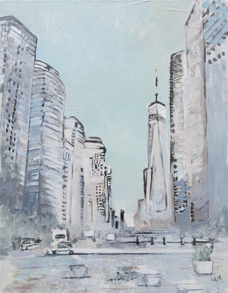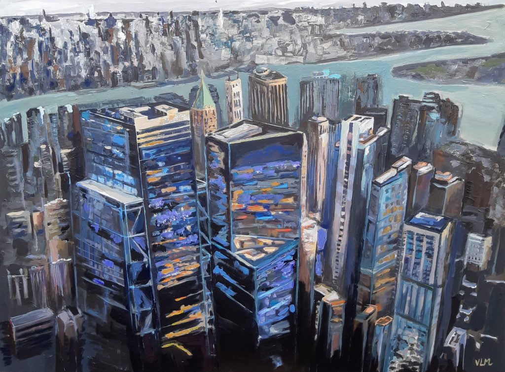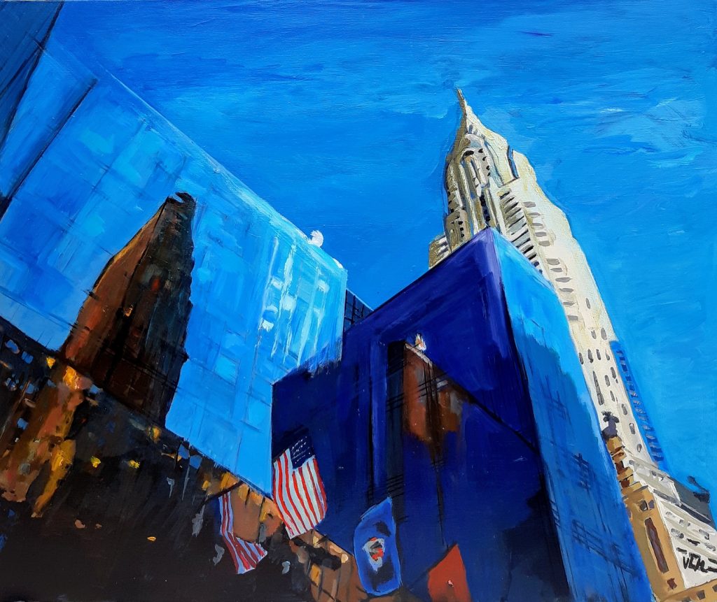Après l’exubérance des tableaux précédents sur New-York , j’ai voulu la représenter dans le calme et la sérénité, totalement à l’opposé de la ville en réalité, puisque c’est une ville qui bouge, qui fait du bruit, où les sirènes des véhicules de secours côtoient les klaxons des voitures.