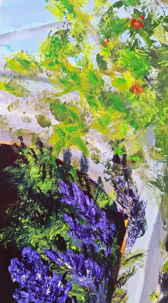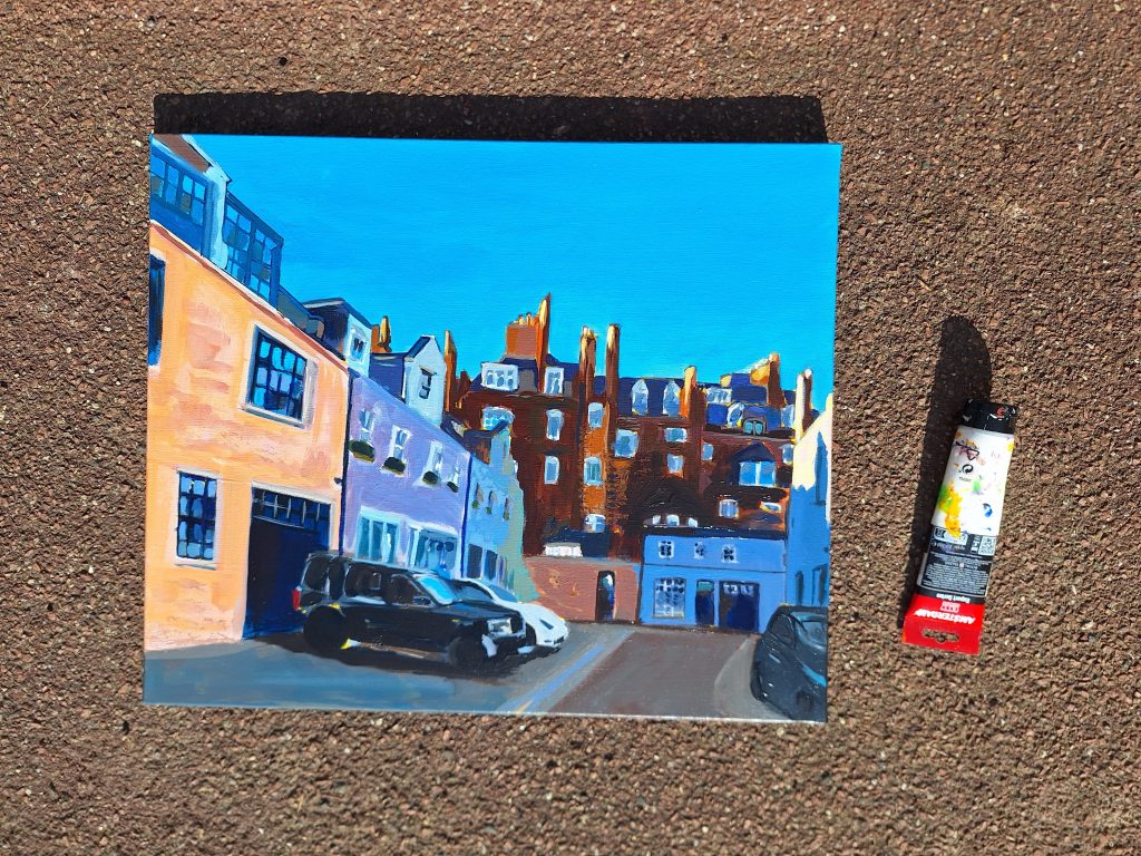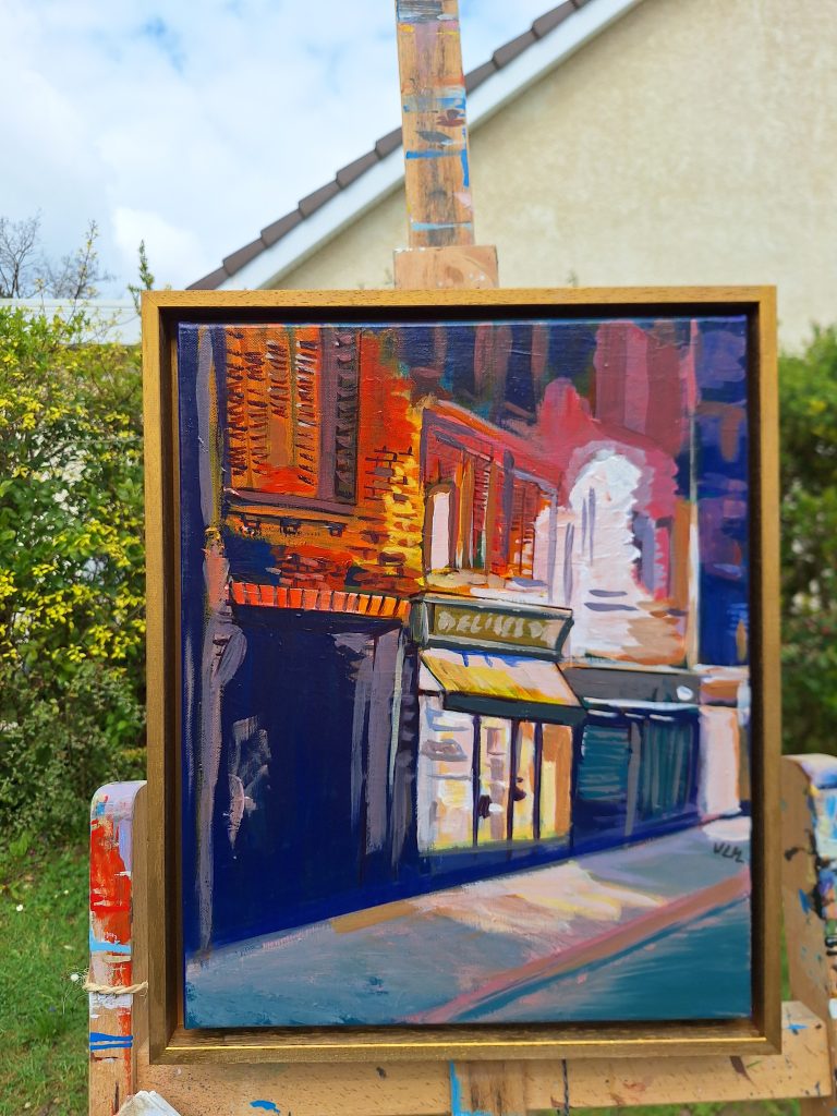 The painting is painted grey on the sides is protected with a glossy acrylic varnish.