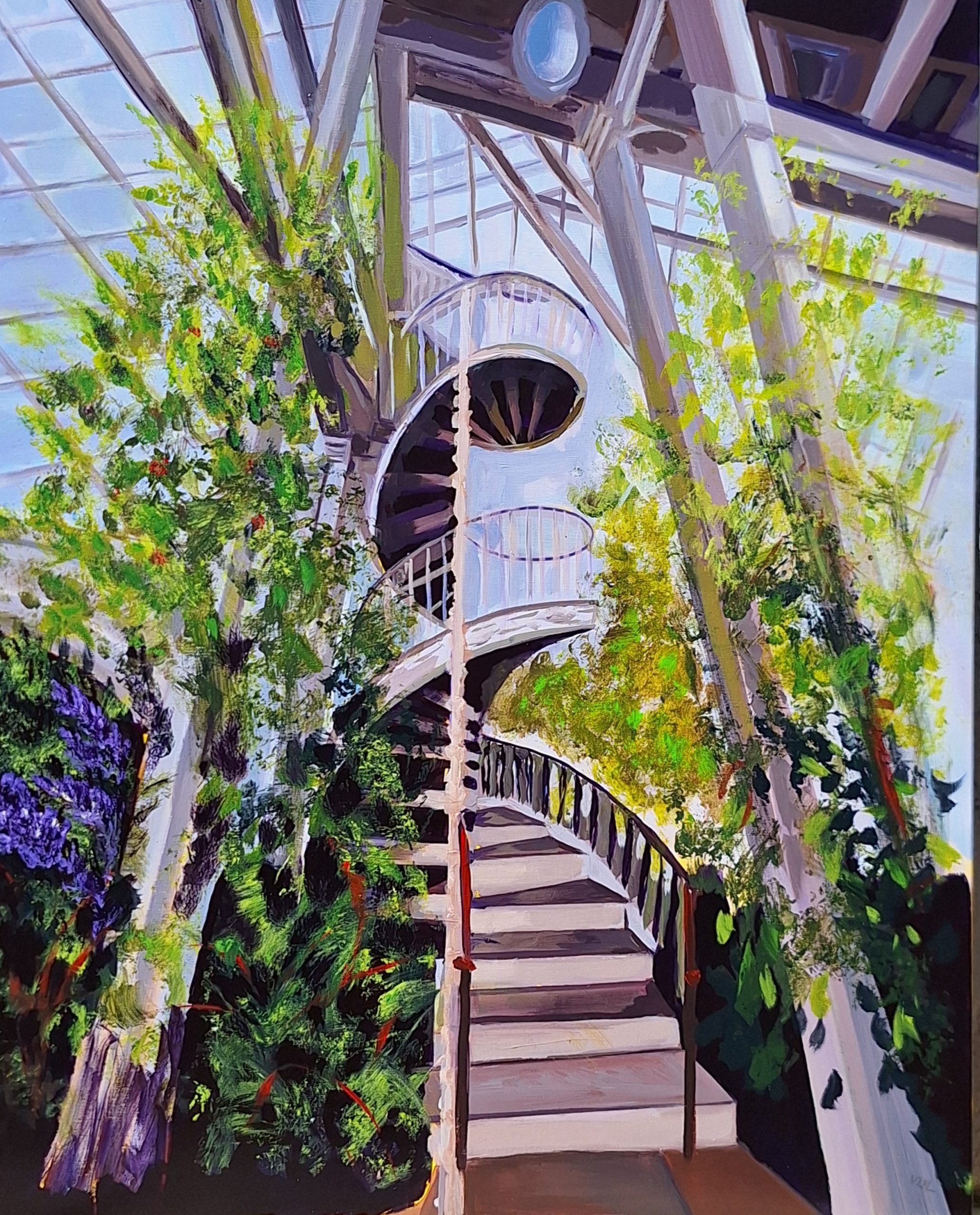 Dans la serre, un escalier long, blanc et élégant se profile et semble s’échapper des plantes et des fleurs qui s’accrochent à lui.
