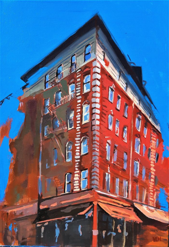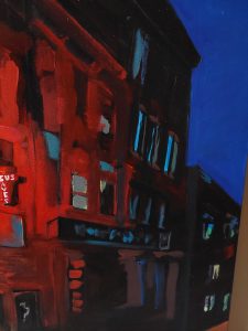 Ici encore il n’y a pas de personnages dans le tableau, mais pour moi c’est une évidence ; ce sont les personnages qui sont centraux dans cette œuvre ; ceux que l’on devine derrière les murs. Hommage à toutes ces personnes engagées bénévolement par une passion, qu’elle soit religieuse, sociale, artistique ou politique.