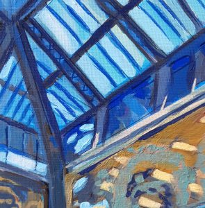 The inside of the building with ironed framed glass roof is a chef-d’oeuvre. The blues and yellows of the site are like a jewellery box for the luxurious products on display: fashion, perfumes, hats and bags: it’s a temple of luxury.