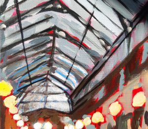 Néanmoins, tout est en nuances, les couleurs vives s’opposent à la lumière douce de la verrière, les touches imprécises des boutiques sont à la limite de l’abstraction. On est dans une atmosphère pas une réalité reproduite ; je laisse à l’amateur d’art une part de rêve.